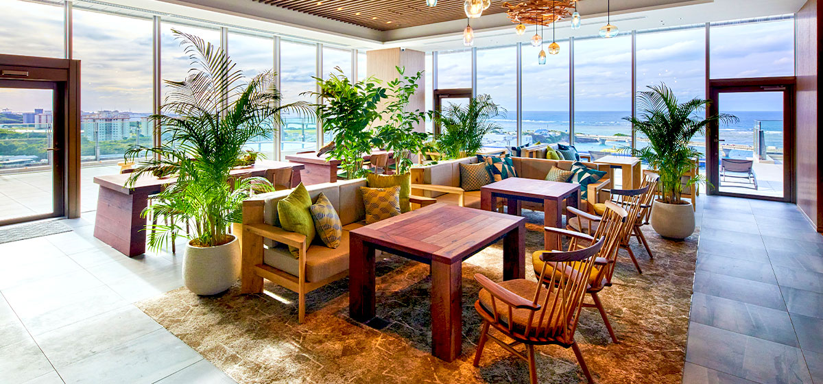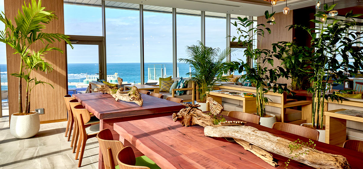 開放感溢れるラウンジで青い海と広い空を